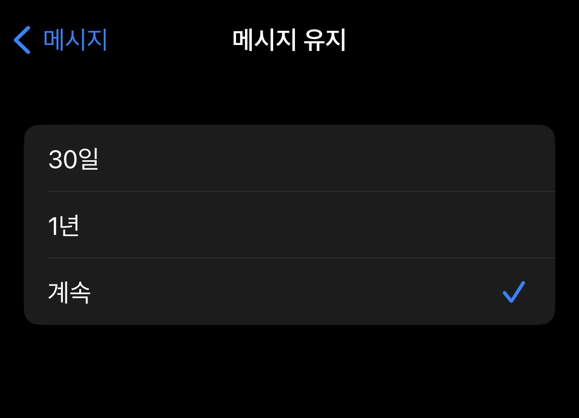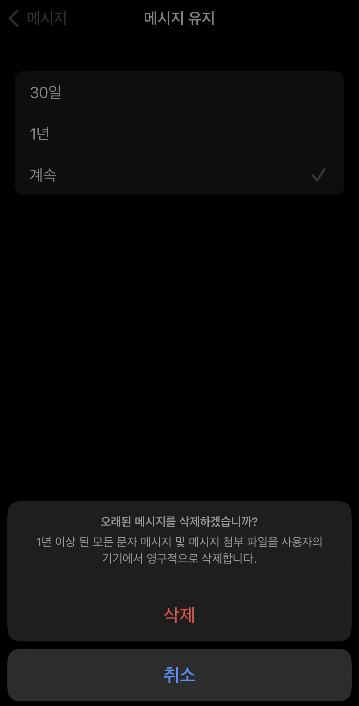 설정 → 메시지 → 메시지 유지 (보관) → 30일 혹은 1년 설정 가능