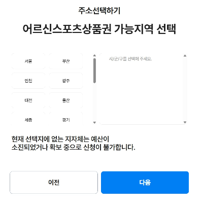 ① 현재 선택지에 없는 지자체는 예산이 소진되었거나 확보 중으로 신청 불가